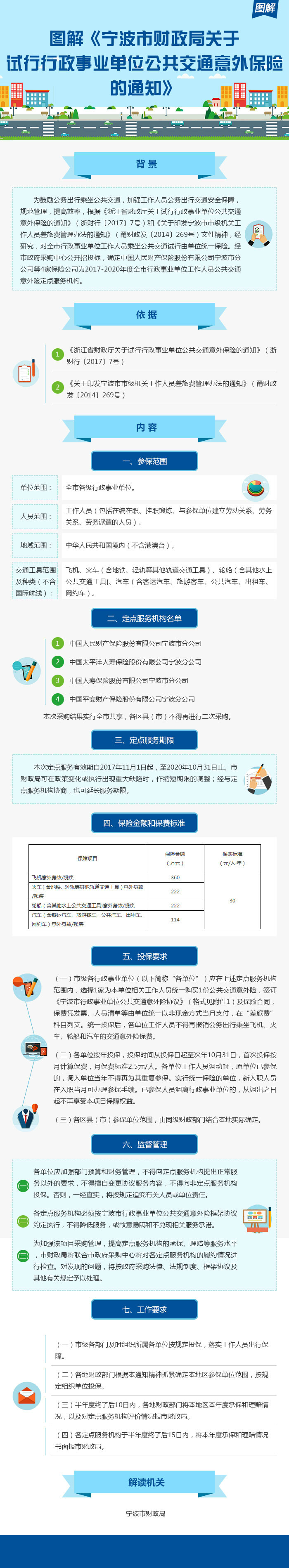 为鼓励公务出行乘坐公共交通,加强工作人员公务出行交通安全保障,规范管理,提高效率,根据《浙江省财政厅关于试行行政事业单位公共交通意外保险的通知》(浙财行〔2017〕7号)和《关于印发宁波市市级机关工作人员差旅费管理办法的通知》(甬财政发〔2014〕269号)文件精神,经研究,对全市行政事业单位工作人员乘坐公共交通试行由单位统一保险。经市政府采购中心公开招投标,确定中国人民财产保险股份有限公司宁波市分公司等4家保险公司为2017-2020年度全市行政事业单位工作人员公共交通意外险定点服务机构。现就参保有关事项通知如下: